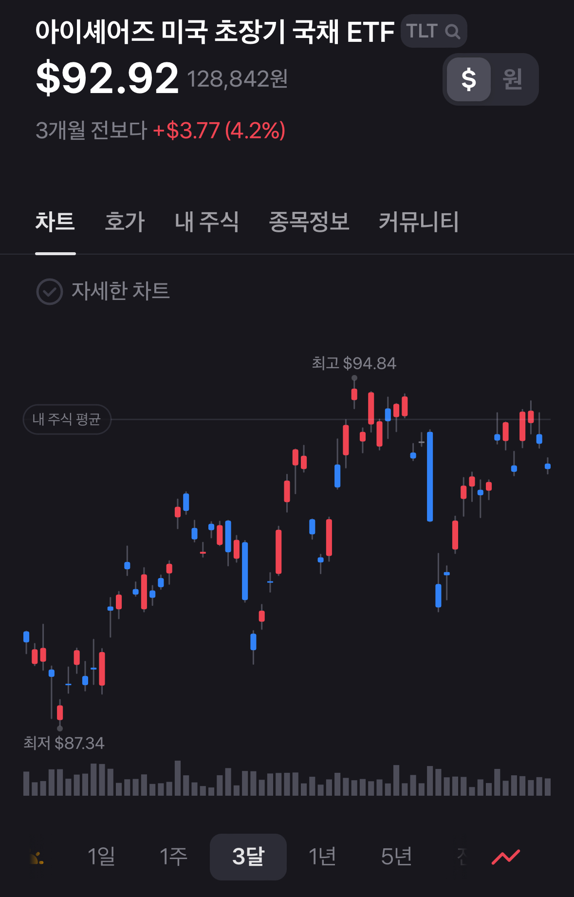 저는 미국 국채 중장기채 TLT ETF를 조금씩 모으고 있습니다. 적금을 넣을 돈이 있다면 무조껀 채권에 투자를 하는게 맞다고 할 수 있죠.