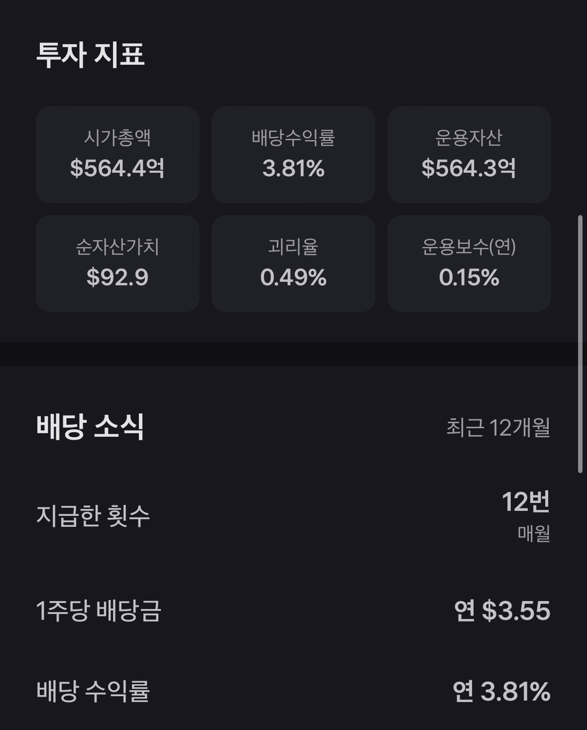 1주당 배당금이 3.55달러로 12개월로 나눈다면 1개당 0.296달러 정도를 받을 수 있습니다. 운용보수를 고려한다고 해도 충분히 장기적으로 투자를 가져가볼만한 내용이죠.