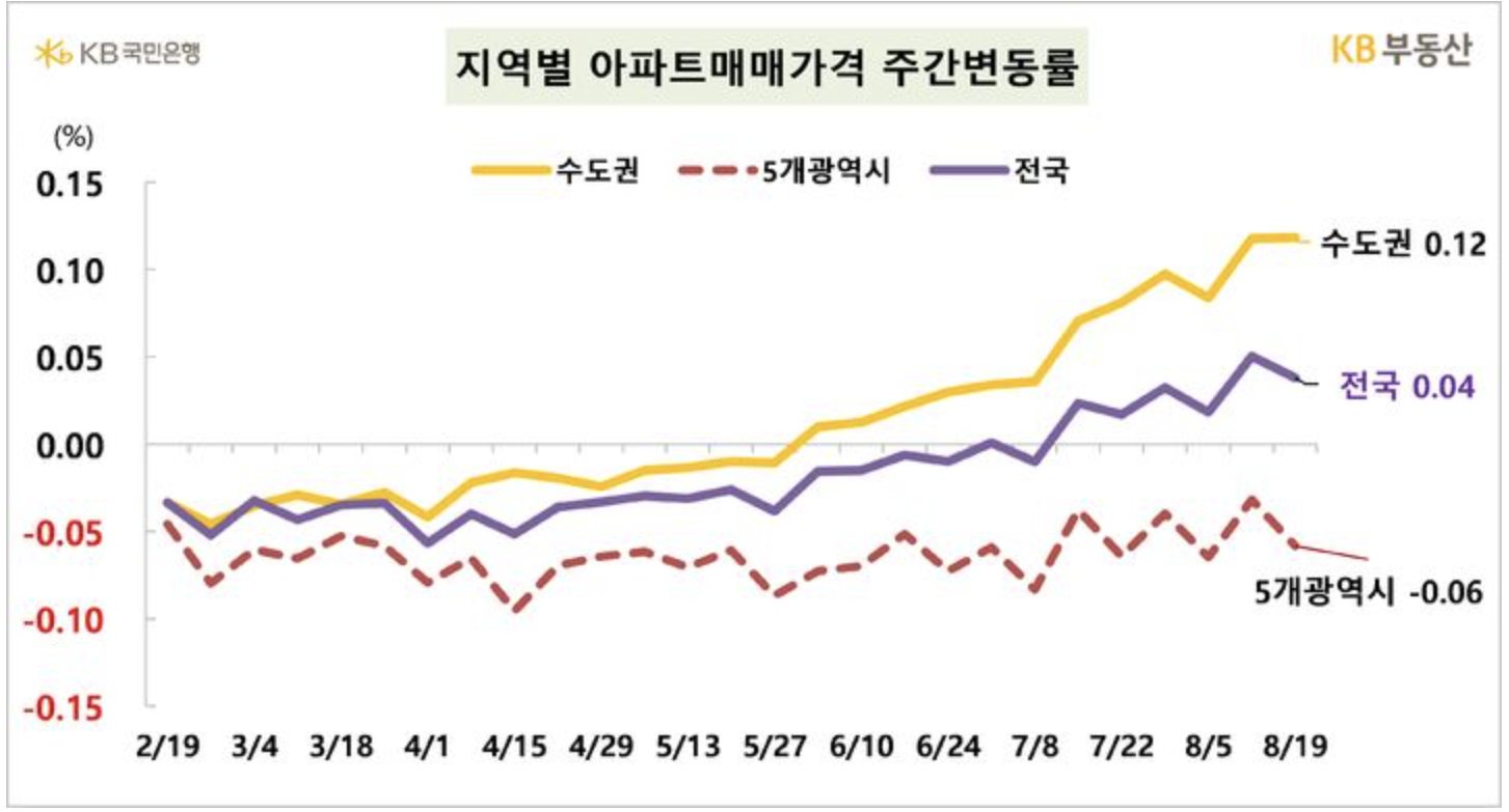 KB국민은행, KB부동산에서 지역 아파트 매매가격 주간변동률을 살펴본 자료 조사를 살펴봐도 최근에 상승은 수도권에 집중적으로 14주째 연속으로 오르고 있다는 말이있습니다. 전국적으로도 많이 오르고 있다는 이야기인데요. 사실 광역시의 가격을 보면 아직까지도 계속해서 마이너스입니다.